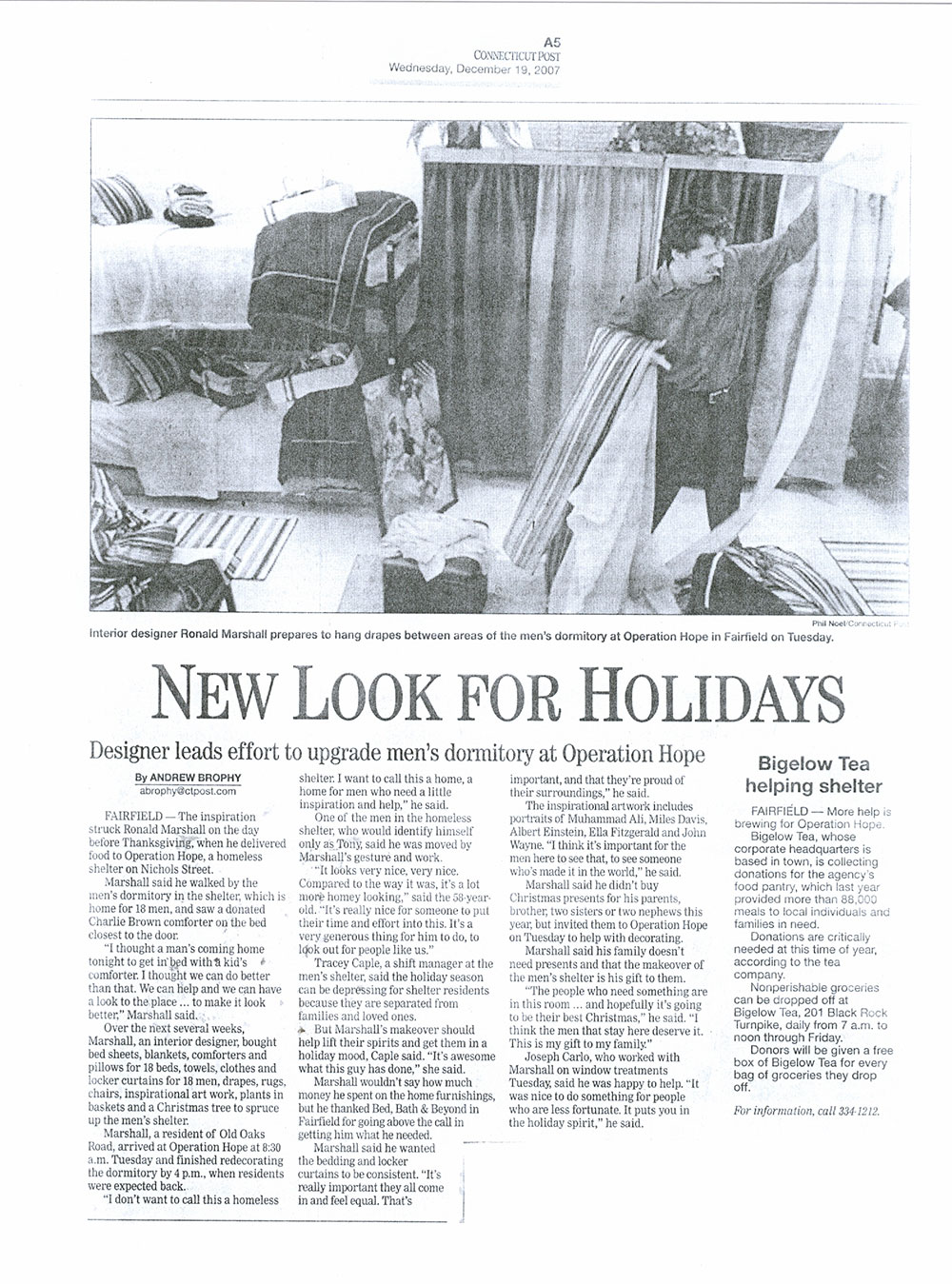 In November of 2007, Ron brought a complete turkey dinner to Operation Hope Shelter in Fairfield, CT. to help feed the men and women who were staying there during Thanksgiving. Much to his surprise, when he dropped the food off, he saw what the men's shelter side looked like. He realized that he can do more than just help feed Operation Hope famlies, he could redesign the entire section with new bed linens, blankets, pillows, towels and even posters of heros for the walls. He not only provided bedding, but furniture, rugs, clothing and even a Christmas Tree.
